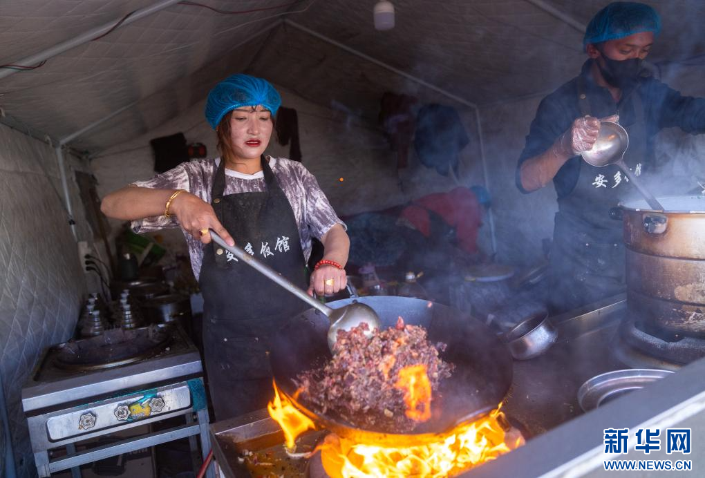 在定日縣長所鄉古榮村,定日縣安多飯館的吉瓊在為安置點的群眾做晚飯(1月15日攝)。新華社記者 丁增尼達 攝