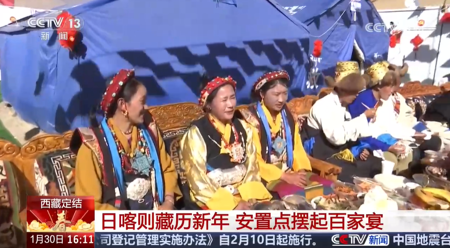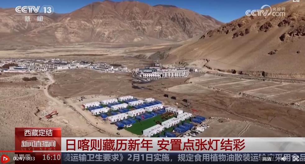 總臺央視記者 王莉:我現在是在日喀則定結縣的切村,今天是這里藏歷年的大年初一,是當地一年中最隆重、最重要的傳統佳節。可以看到,現場已經裝點得很有節日的氛圍,家家戶戶都貼上了春聯,掛上了喜慶的燈籠和福字。雖然今年在安置點里過年,但人們依然保持著傳統的習俗,在這一天,一定要穿上隆重的藏裝,一起吃一頓團圓飯。