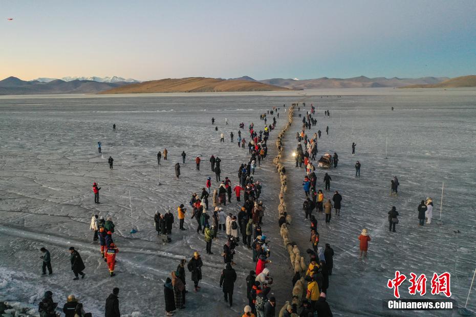 2月7日,西藏山南市浪卡子縣推瓦村1400多只羊通過普莫雍錯冰湖,前往湖心島。據悉,位于西藏山南市浪卡子縣的推瓦村,平均海拔約5070米,是世界上海拔最高的行政村,以牧業為主。由于推瓦村海拔高、夏季短,草場無法為羊群提供充足的過冬飼料,因此,每年高原最冷的時候,推瓦村牧民會把羊群趕到普莫雍錯水草豐茂的湖心島,依靠島上的草料度過最寒冷的冬期。圖為牧民準備趕羊轉場度過最寒冷冬期。(無人機照片)中新社記者 貢嘎來松 攝