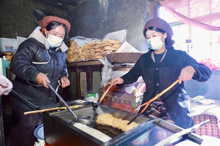 “德卡”,作為傳統(tǒng)藏式點(diǎn)心“卡塞”的一種,在藏歷新年的年貨清單里占據(jù)著不可或缺的位置。每到藏歷新年前夕,旦索朗一家便進(jìn)入了一年中最忙碌的時(shí)段——經(jīng)營(yíng)起制作和售賣卡塞的生意。旦索朗回憶起小時(shí)候的新年,感慨萬分:“小時(shí)候過年,家家戶戶都自己炸卡塞,那時(shí)候,整個(gè)村子都被卡塞的濃香包圍著。現(xiàn)在生活條件好了,很多人覺得在外購買德卡更方便省事,這也給我們帶來了商機(jī)。我們做炸德卡的生意已經(jīng)6年了,一直都很受歡迎,還帶動(dòng)了6名村民一起參與,增加了大家的收入。”