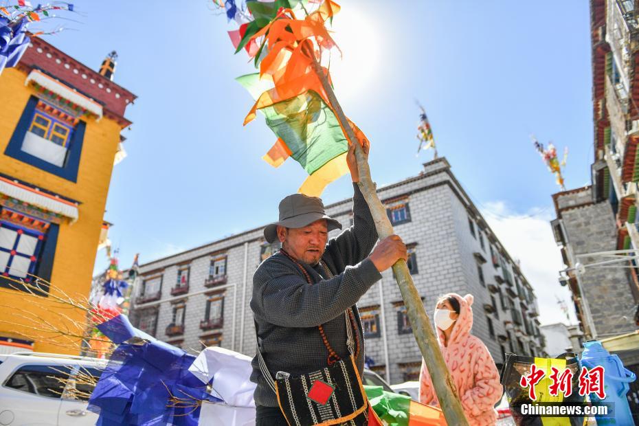 臨近藏歷新年,2月16日,在西藏拉薩街頭,農(nóng)牧民正縫制五彩經(jīng)幡樹(shù)。五彩經(jīng)幡樹(shù)是藏族民眾在藏歷新年前必備的年貨之一。藏歷新年期間,藏族民眾會(huì)選擇一個(gè)良辰吉日,為自家的房頂更換五彩經(jīng)幡樹(shù),祈求新的一年里五谷豐登,吉祥如意。圖為2月16日,來(lái)自尼木縣的普瓊扛著五彩經(jīng)幡樹(shù)。貢確 攝