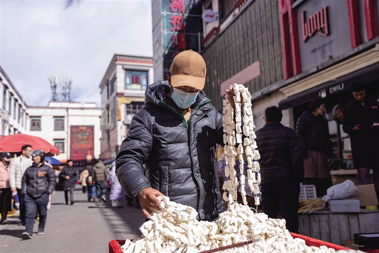 在拉薩市城關區八廓商城,絨布燙金的藏式對聯、色彩艷麗的“羅薩梅朵”……花樣繁多的各類年俗用品與傳統年貨吸引了眾多市民群眾前來選購。