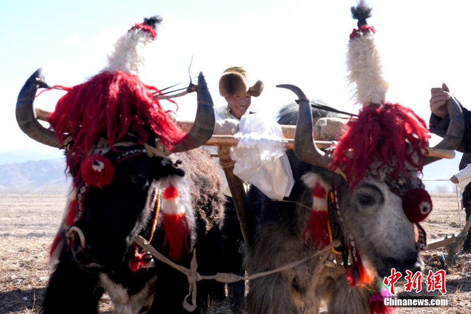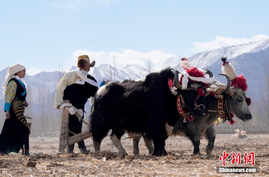 3月16日,是西藏農(nóng)區(qū)開耕的日子。村民身著節(jié)日盛裝,相聚在田間。傳統(tǒng)的“二牛抬杠”開啟“第一犁”后,拖拉機(jī)緊隨其后,婦女將手中的種子撒下,祈求風(fēng)調(diào)雨順、農(nóng)業(yè)豐收。圖為西藏拉薩市林周縣強(qiáng)嘎鄉(xiāng)春耕儀式現(xiàn)場,“二牛抬杠”開啟“第一犁”。中新社記者 李林 攝