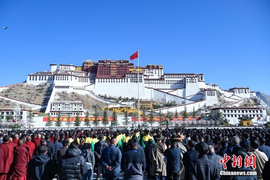 3月28日,西藏各族各界人士聚集在拉薩布達拉宮廣場,升國旗、唱國歌,參加西藏百萬農奴解放66周年紀念活動。圖為升國旗儀式現場。