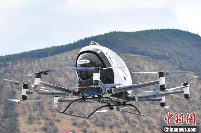 4月5日,西藏林芝第二十二屆桃花旅游文化節上,億航智能桃花載人無人機E-VTOL首次亮相海拔3000米高度,并成功首飛。首飛現場,無人機緩緩升空,引得市民、游客紛紛駐足仰望,降落之后,大家圍攏過來,近距離參觀體驗并拍照留念。據悉,億航智能已在國內合肥、杭州等地開展低空文旅項目,在全球19個國家,完成65000架次安全飛行。圖為載人無人機E-VTOL準備進行首次飛行。貢確 攝