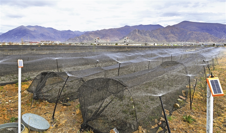 藏建物生鄉土苗木培育基地內的全自動灌溉設備。記者 次仁平措 攝