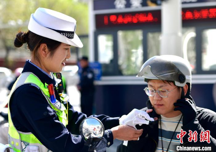 圖為拉薩市公安局交警支隊城北大隊副大隊長胡花芳為駕駛員調節頭盔。李林 攝