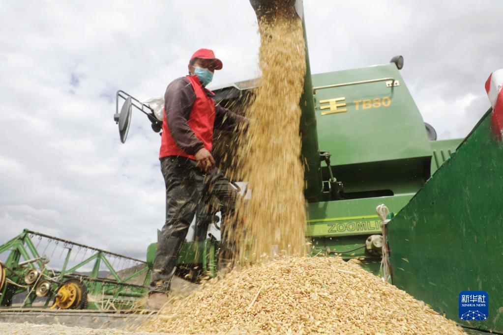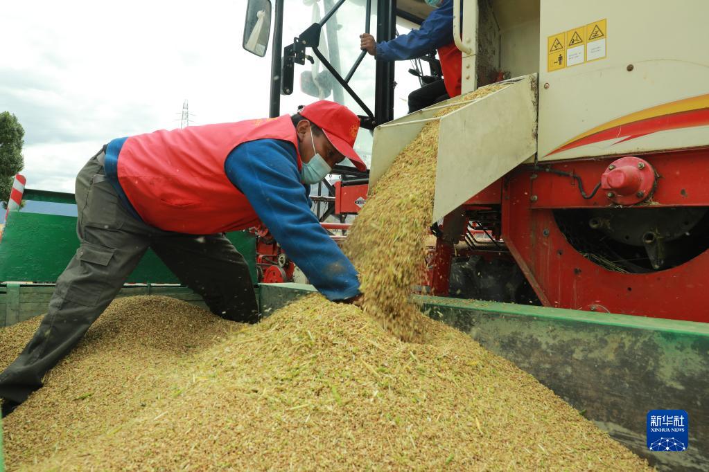 目前,西藏各地進(jìn)入秋收時節(jié)。西藏拉薩市墨竹工卡縣農(nóng)民在積極防疫的同時,抓緊收割青稞,確保顆粒歸倉。