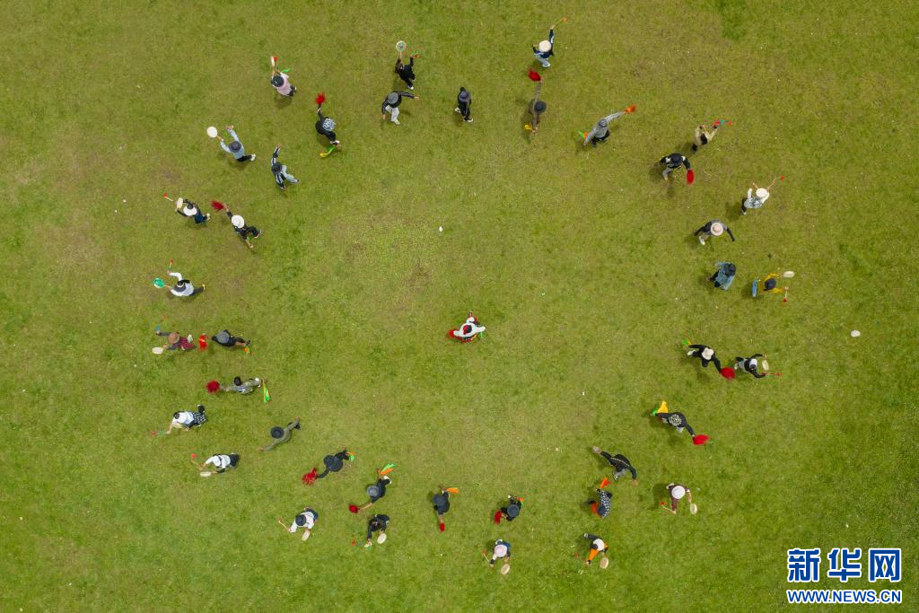 7月12日,西藏昌都市丁青縣尺犢鎮烏巴村文藝演出隊在排練(無人機照片)。 新華網 旦增努布 攝