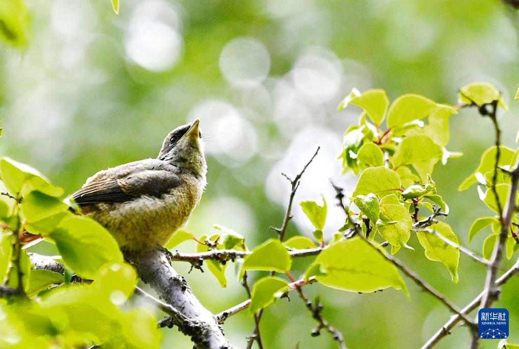 一只伯勞在拉薩市城關區一處庭院樹枝上為幼鳥“警戒”(7月28日攝)。新華社記者 張汝鋒 攝