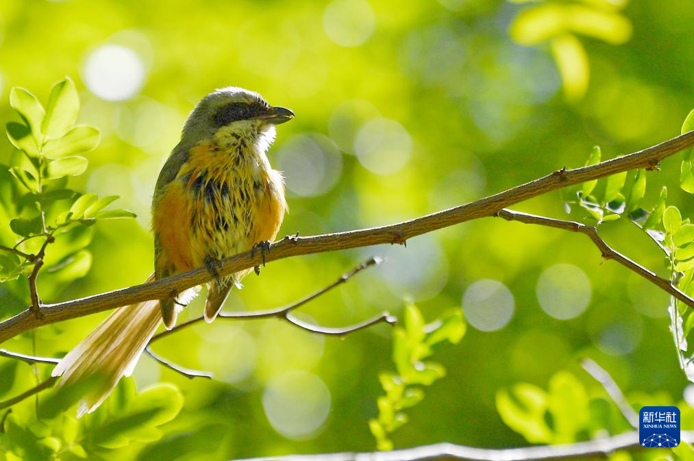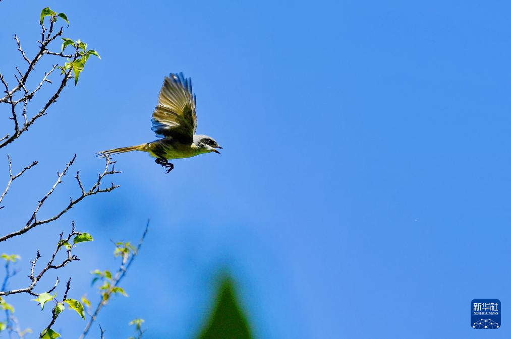 在拉薩市城關區一處庭院,一只伯勞飛離枝頭(7月28日攝)。新華社記者 張汝鋒 攝