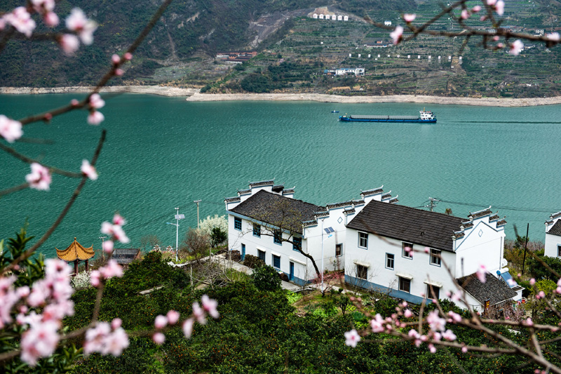 這是2021年2月27日在三峽庫區秭歸縣屈原鎮西陵峽村拍攝的鮮花盛開的臍橙園。湖北省宜昌市秭歸縣在建設美麗鄉村中,因地制宜,在臍橙園里種植桃樹、李樹等果樹。