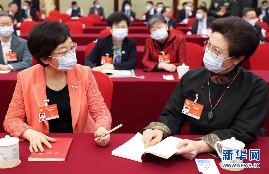 3月6日,王宜(右)委員和肖新月委員在全國政協十三屆四次會議醫藥衛生界、教育界委員聯組會前交流。新華社記者 黃敬文 攝