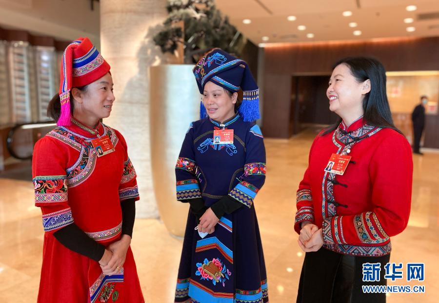 3月6日,三位女代表在駐地交流。新華社記者 溫競華 攝