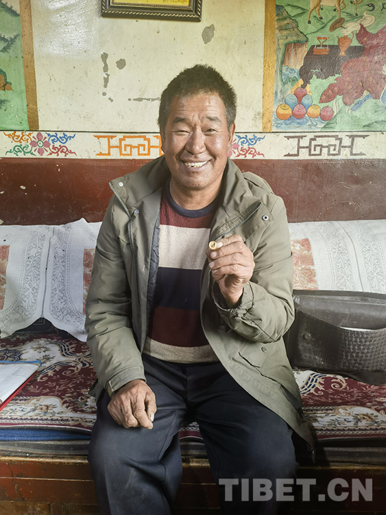 索杰醫生取出第三個包的時候,格外小心翼翼。我們因此也就更好奇,里面又是什么“寶藏”。“我1986年入黨,1997年當村大隊的副隊長。2010年,鄉里在12個村的大隊長中,選兩名優秀人員,我就是其中之一。”索杰醫生邊說,邊慢慢拿出一個盒子,打開盒蓋,把手在衣服角上抹抹,然后取出一枚金黃閃亮的毛主席像章。“當時我們縣一共去了20人,先到那曲市委黨校學習了8天,然后到北京和大連分別參觀學習7天。在北京,我去了毛主席紀念堂、天安門、長城、鳥巢、水立方。我在天安門廣場買了鮮花,到毛主席紀念堂門口時,先是有點緊張,因為那里站崗的軍人。我把鮮花放在一個統一的地方,瞻仰毛主席遺容時,我緊張的心情一下子沒有了,都變成了激動。”索杰醫生把手放在心臟的位置比劃著,“為了紀念毛主席,我就買了一枚毛主席像章。”