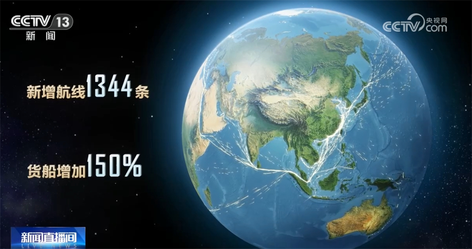 向大海,這是2013年時中國與共建“一帶一路”國家間的水運航線。十年間,共建“一帶一路”國家間的水運航線數量翻了一番,新增航線達到了1344條,穿梭其中的貨船增加150%。“絲路海運”航線已通達全球43個國家的117個港口,織出了一張聯通世界的貿易流動網絡。